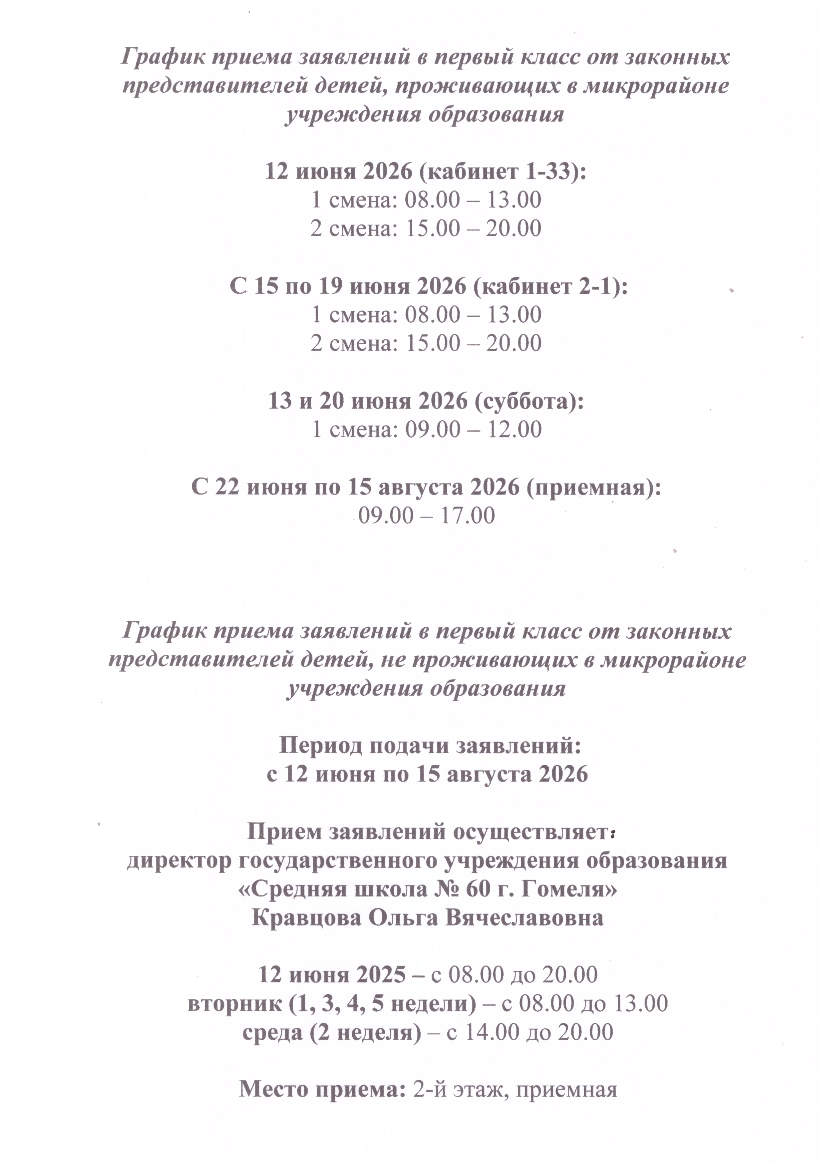 В первую очередь принимаются в 1 класс дети, проживающие в микрорайоне, закреплённым за ГУО «Средняя школа №60 г.Гомеля».