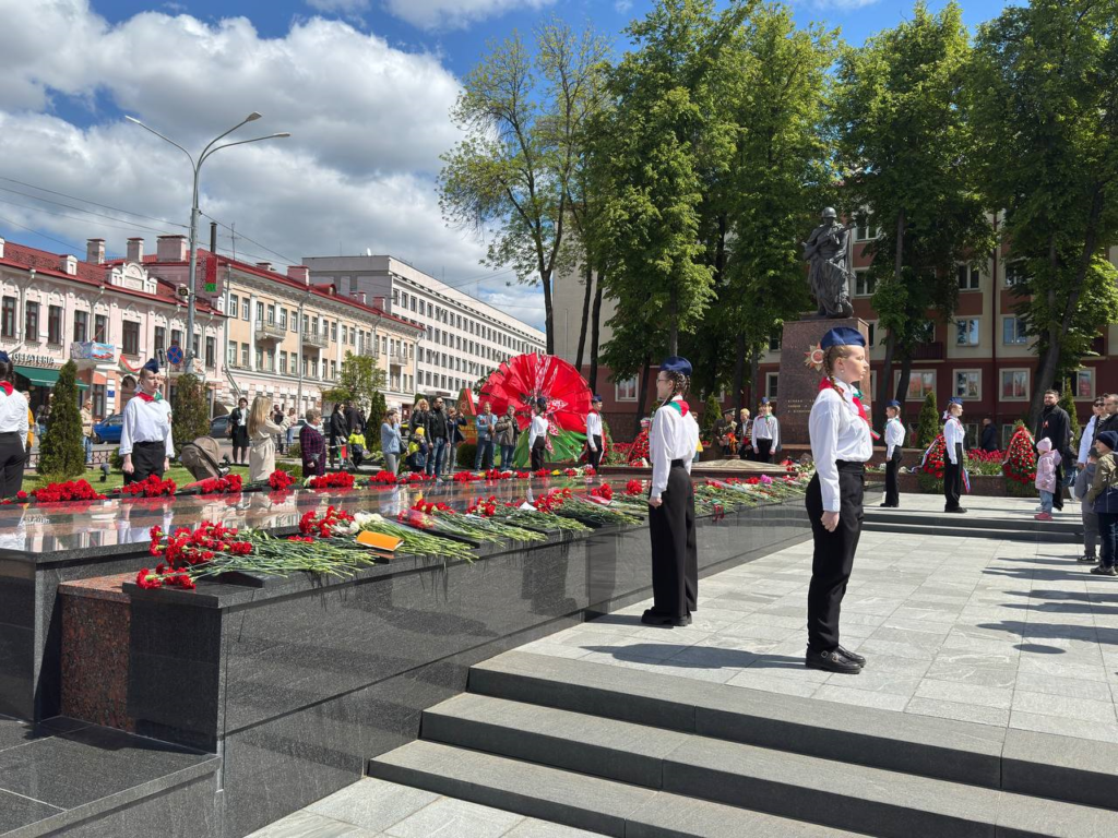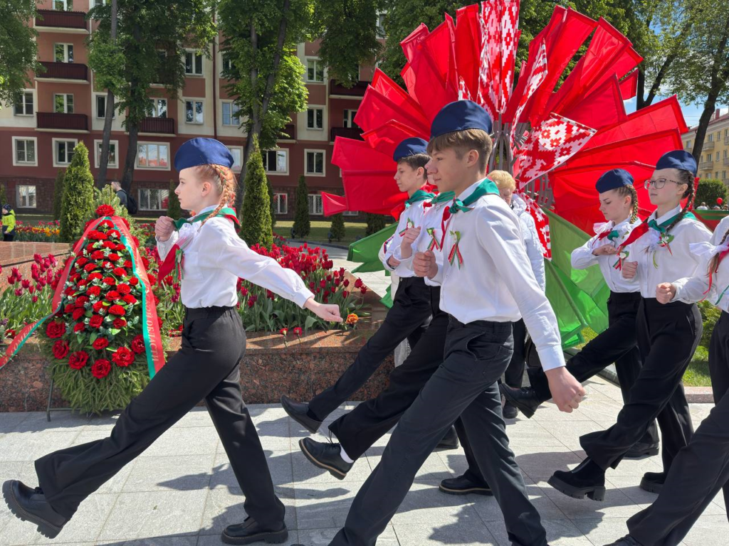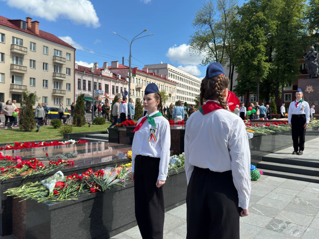 В День Великой Победы, учащиеся ГУО «Средняя школа №60 г. Гомеля» получили почётное право нести Вахту памяти «80 дней до Победы» у братской могилы советских воинов и подпольщиков на площади Труда.